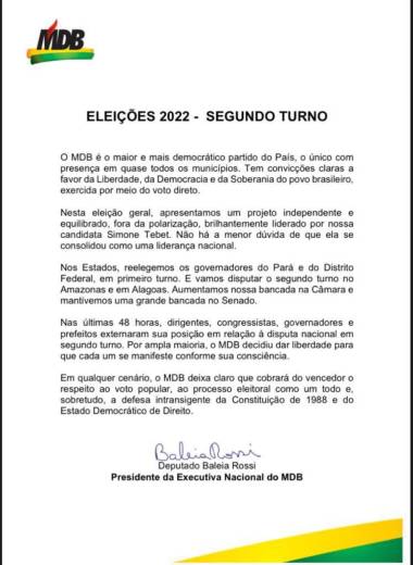 “Em qualquer cenário, o MDB deixa claro que cobrará do vencedor o respeito ao voto popular, ao processo eleitoral como um todo e, sobretudo, a defesa intransigente da Constituição de 1988 e do Estado Democrático de Direito”, conclui.