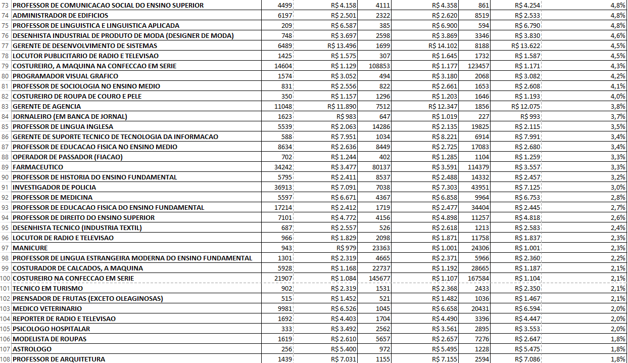 Confira, abaixo, a tabela com as 131 profissões onde mulheres ganham mais que os homens no Brasil. Elas estão ordenadas de acordo com a diferença salarial – da maior para a menor. Além do salário médio por gênero, a tabela tem o salário médio do conjunto (homens e mulheres) e as respectivas quantidades de trabalhadores, e a última linha apresenta os resultados das 2509 ocupações, mostrando a diferença salarial de 19% no geral.