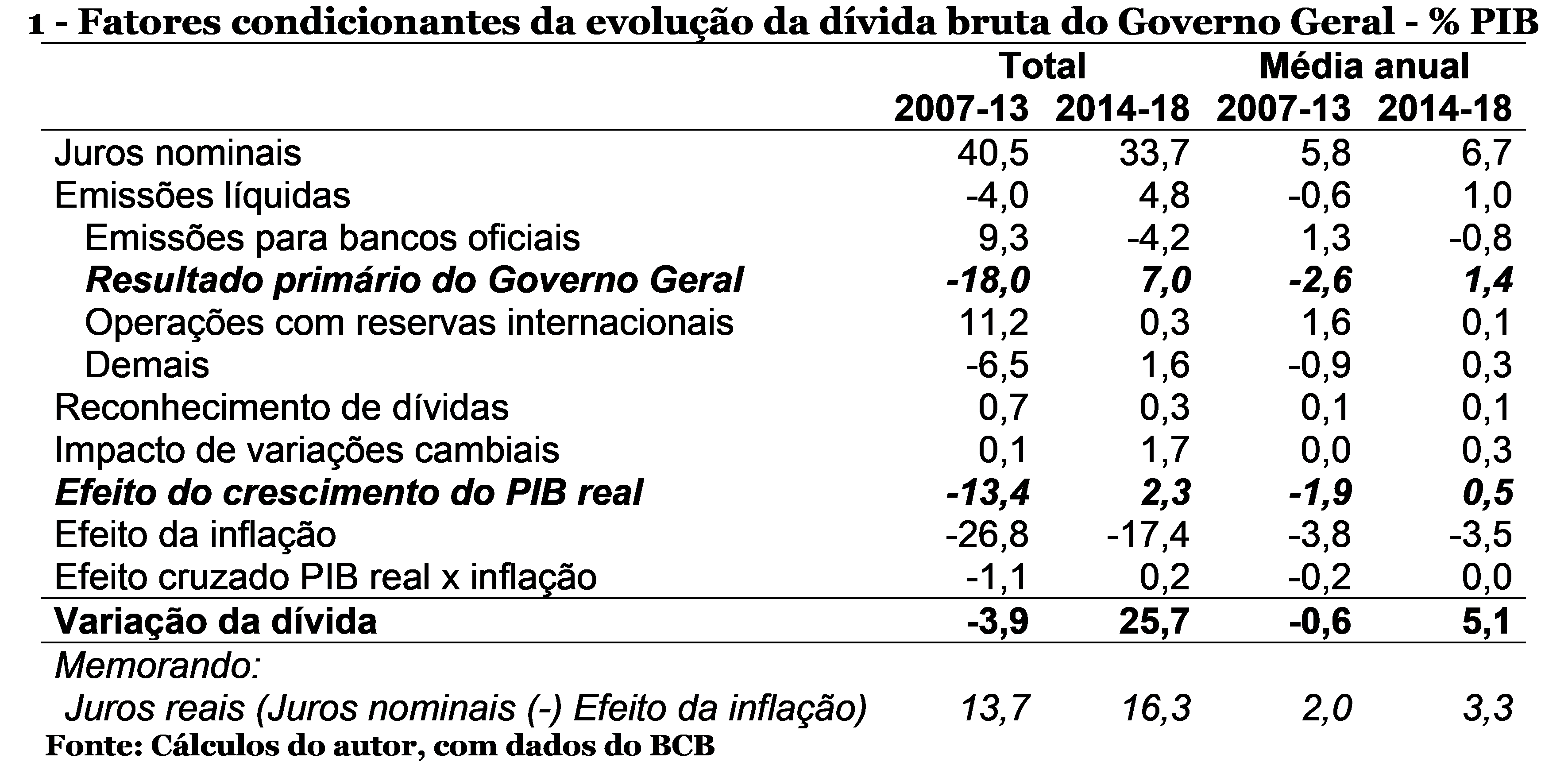 Como se vê, os superávits primários no período 2007 a 2013 abateram em média 2,6% do PIB por ano da dívida bruta, enquanto os déficits primários registrados entre 2014 e 2018 adicionaram 1,4% do PIB por ano à dívida bruta.