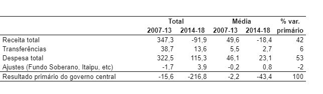 A tabela acima mostra a variação do resultado primário entre os anos de 2007 e 2013 e de 2014 a 2018. No segundo intervalo, quando o superávit se transformou em déficit (variação negativa de R$ 217 bilhões), as despesas aumentaram R$ 115 bilhões, enquanto as receitas caíram R$ 92 bilhões. Muito embora o crescimento médio das despesas (R$ 23 bilhões por ano) tenha sido mais lento do que no período anterior (R$ 46 bilhões/ano), ele representou mais da metade (53%) da piora observada do resultado primário.