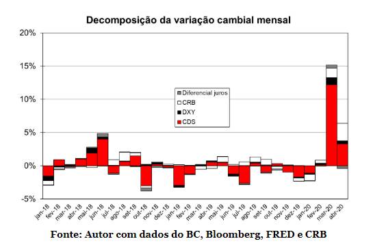 Como sugerido pelo gráfico acima, construído com base em um modelo simples, o principal determinante do comportamento recente da moeda parece ser o risco-país, medido pelo CDS de 5 anos (o custo do seguro contra um calote nacional), que saltou de cerca de 1% ao ano no começo de 2020 para mais de 3% ao ano em março e abril.