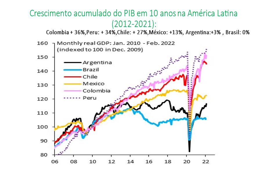 Nos últimos dez anos (2012-2021) o PIB brasileiro cresceu zero no acumulado do período, ficando bastante para trás inclusive do crescimento dos seus pares latino-americanos.