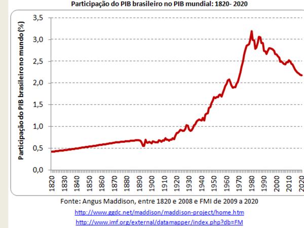 Desde o início da década de 80 o Brasil foi perdendo dinamismo econômico, crescendo menos que a média da economia global. Depois de um crescimento acelerado em grande parte do século XX, onde a participação da economia brasileira saiu de pouco mais de 0,5% no PIB mundial para mais de 3%, as últimas 4 décadas presenciaram uma forte retração dessa participação.