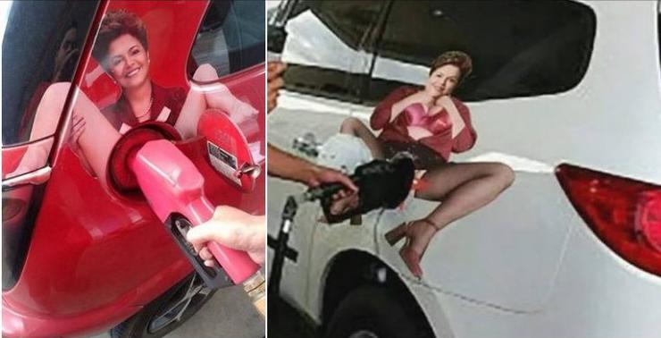 Começou a circular na internet imagens de carros com adesivos colados na entrada do tanque de gasolina, onde a presidente aparece de pernas abertas, com a entrada do tanque de gasolina ficando entre suas pernas
