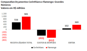 Nos próximos dados comparativos, há diferenças na forma que os clubes apresentaram suas informações, dificultando algumas comparações. Por exemplo, o Corinthians não destaca as receitas com Social nem os valores de Sócios Torcedores, enquanto nos Custos e Despesas, o Flamengo não detalha absolutamente nada. O Corinthians apresenta uma abertura um pouco maior, mas também sem separar Futebol do Social.
