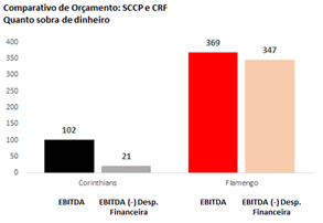 Aqui, temos os valores de Ebitda orçados e após dedução das Despesas Financeiras. Importante lembrar que nem todas as despesas financeiras precisam ser pagas. Algumas são apenas correção de saldo de dívida, que significam aumento de valores a serem pagos no futuro.Observando os números ao lado, fica claro que sobra pouco dinheiro para o Corinthians reduzir dívidas e pouca margem de manobra para correções de rotas, enquanto no Flamengo o cenário é de certo conforto. Afinal, além de gerar mais caixa (Ebitda), ainda tem despesas financeiras comportadas. |