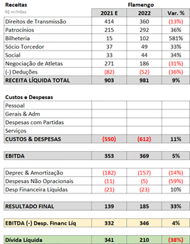 O Flamengo trabalha com crescimento de receitas bem mais modesto, da ordem de 9%. Aqui, cabe a mesma explicação para receitas de Transmissão, pois em 2021 há receitas de 2020. Fazendo o ajuste, o crescimento esperado para 2022 é de 11%.O clube trabalha com crescimento em todas as linhas, e o mais importante é o de Patrocínios, considerando que Bilheteria e Sócio Torcedor estavam impactados no ano passado pelos estádios fechados. A Negociação de Atletas vem abaixo de 2021, mas segue sendo um tema de difícil previsão.Infelizmente, o clube não detalha os Custos e Despesas, e nos cabe informar que não dá para fazer maiores análises. Mas o número cresce ligeiramente acima das Receitas Totais. Porém, o ponto de destaque é o tamanho do Ebitda, bastante relevante, e maior que as receitas de grande parte das equipes da Série A do Brasileiro.O resultado é bastante confortável e, para isso, contribuem as despesas financeiras comportadas em função do endividamento sob controle.Um item que o clube apresenta e merece destaque é o do Endividamento. Porque não basta olhar as contas do ano, mas como elas refletem na estrutura geral do clube, que é medida pelo tamanho do endividamento.Veja que, após deduzir as despesas financeiras do Ebitda, o clube ainda teria R$ 346 milhões de recursos para pagar dívidas e investir. E o orçamento aponta redução de R$ 130 milhões em dívidas em 2022.Isso dá uma enorme folga na gestão, que pode se planejar, contratar e até aumentar gastos se houver alguma necessidade. |
