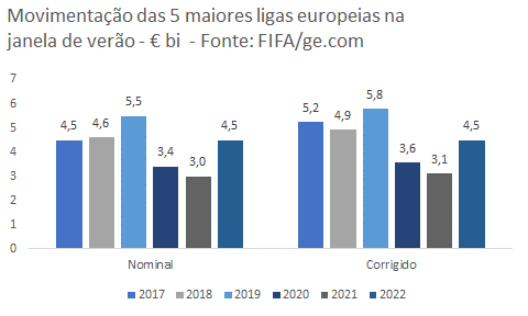 Nominalmente, voltamos aos patamares de 2017 e 2018. Mas, considerando que temos uma inflação na Europa na casa dos 8,5%, faz sentido compararmos com os valores ajustados. Nessa comparação, a movimentação de 2022 foi ligeiramente inferior a 2018, mas substancialmente maior que 2020 e 2021, mostrando que de fato o futebol já retomou sua normalidade.