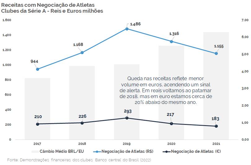 Tanto em euros quanto em reais, os valores de receitas auferidos pelos clubes da Série A brasileira sofreram redução em 2020 e 2021. Naturalmente, há uma explicação baseada na pandemia, pois todos os clubes na Europa e em mercados menores sofreram com redução de receitas, levando a corte de gastos e investimentos. Mas limitar a análise a essa informação e ignorar as transformações pelas quais o futebol europeu vem atravessando é correr o risco de ficar apenas com parte da realidade, e todos sabemos o que isso significa.