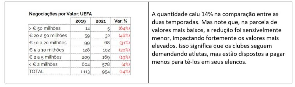Portanto, o que se espera para o mercado brasileiro de negociação de atletas é uma redução na demanda por atletas acima de 23 anos, com concentração naqueles entre 18 e 21, e uma tendência à redução nos valores. Ou seja, cada vez mais é fundamental formar bem, em quantidade e com qualidade. Os clubes tendem a ter que negociar mais atletas para poder alcançar os valores que antes eram atingidos com uma ou duas negociações.