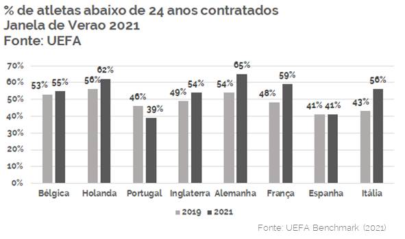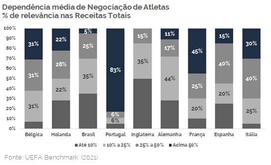 Enquanto no Brasil, em 2021, apenas 5% dos clubes da Série A tiveram receitas com negociação de atletas representando acima de 50% do total, na Bélgica esse número foi de 31%, na Holanda, 22%, na Alemanha foi de 11%, França e Itália atingiram 45% e 30% e Portugal chegou aos 84% de clubes com receitas de negociação de atletas representando mais de 50% de suas receitas.
