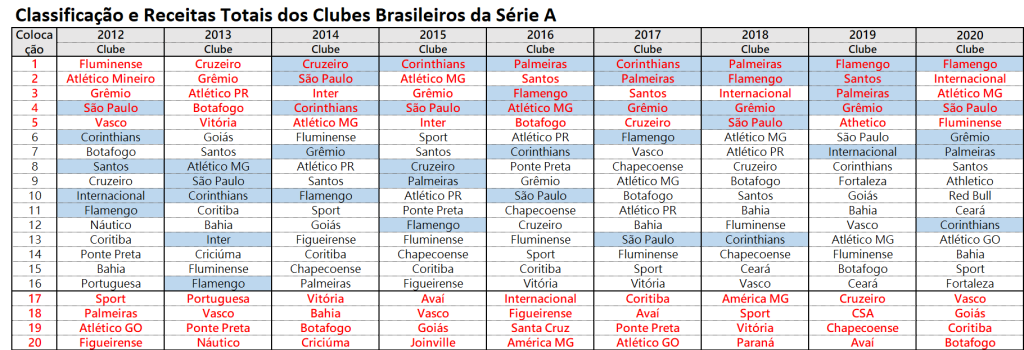 Na tabela, temos a classificação da Série A entre 2012 e 2020. As cinco maiores receitas estão marcadas em azul. Já os cinco primeiros colocados e os quatro rebaixados estão marcados em vermelho.