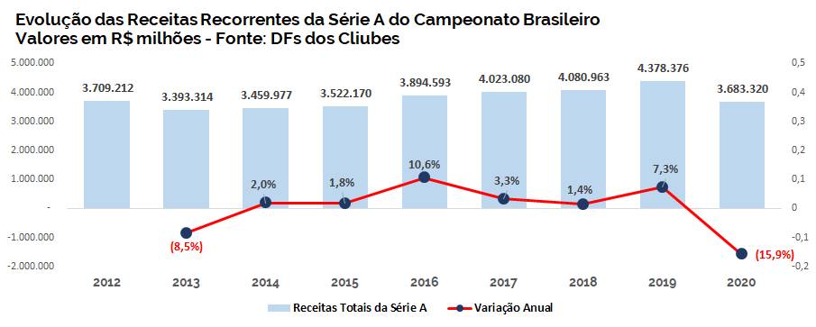 Apenas em 2020 tivemos dois clubes com receitas abaixo de R$ 200 milhões, sabendo que no Atlético Mineiro a receita teve reforço de dinheiro de sócios e os gastos com salários não foram compatíveis com esses valores.