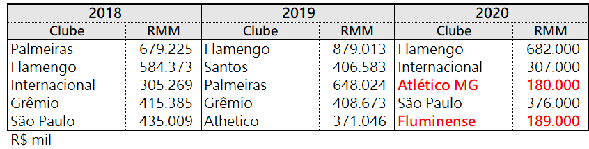 Na tabela abaixo, temos as receitas dos cinco primeiros colocados da Série A entre 2018 e 2020: