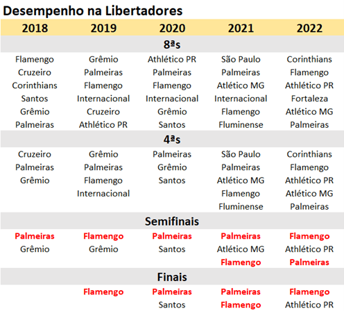 Na tabela acima, temos os clubes brasileiros classificados para a Libertadores pelo Brasileirão. Note que, nos últimos cinco anos, apenas dois clubes participaram de todas as edições: Flamengo e Palmeiras, os suspeitos de sempre.