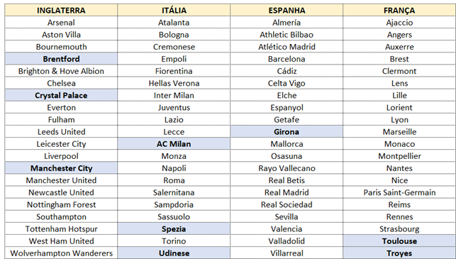 Se pensarmos nas quatro maiores ligas europeias que possuem clubes com donos – excluímos a Alemanha por conta da regra do 50%+1 que dificulta a presença de acionistas nos clubes – e analisarmos seus clubes, veremos que a maioria é composta por donos únicos ou grupos econômicos.