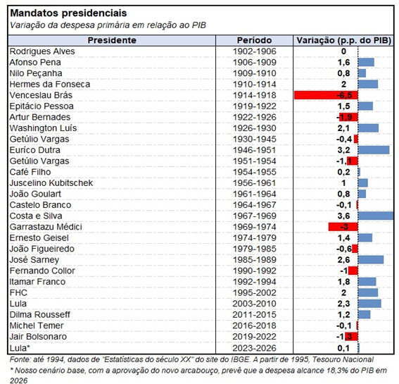 A propósito, no perÃodo entre 1901 e 2022, considerando o gasto no inÃcio do mandato presidencial, e aquele verificado no fim dele, verifica-se sistematicamente variação positiva da despesa primária em relação ao PIB (ver tabela).