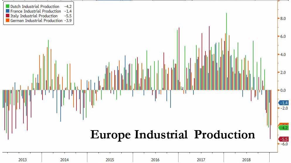 Seguindo adiante, vamos olhar os números do crescimento industrial nos principais países da Zona do Euro, onde uma rápida deterioração da atividade aconteceu no 4T18. Atenção especial à Alemanha que possui o maior parque industrial do bloco.