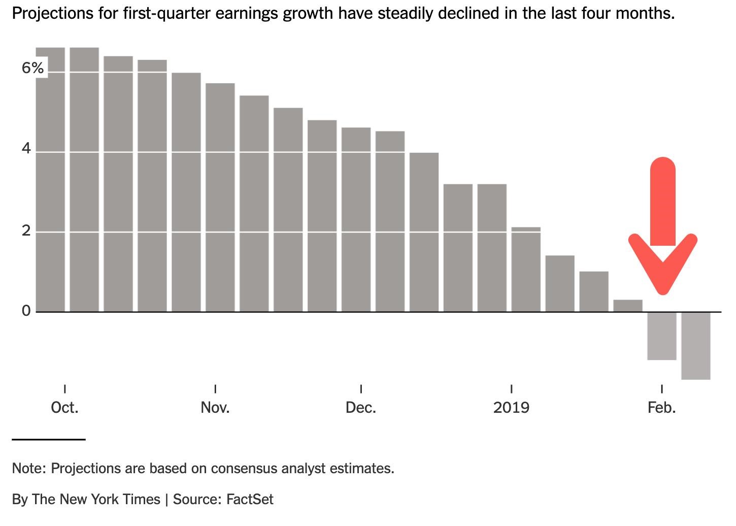 Quanto aos EUA, mesmo sendo o bloco econômico com melhor desempenho relativo, podemos notar através das projeções de lucro das empresas no 1T19 que o ambiente também vem deteriorando rapidamente.