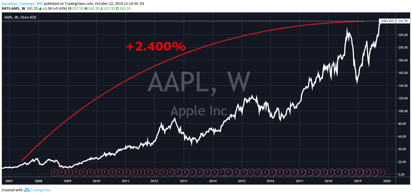 Estão aí as ações da Apple subindo como um foguete e com retornos de mais de 2.300% desde esse lançamento que mudou a empresa (veja o gráfico abaixo).