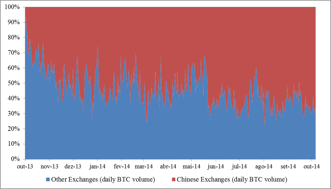 A entrada das exchanges chinesas impactou definitivamente o mercado de bitcoins. A BTC China, que em setembro de 2013 negociava cerca de 10 mil BTC diariamente, passou a um volume diário de mais de 100 mil BTC um mês e meio depois – isso dá uma ideia do crescimento súbito e acentuado do mercado chinês.