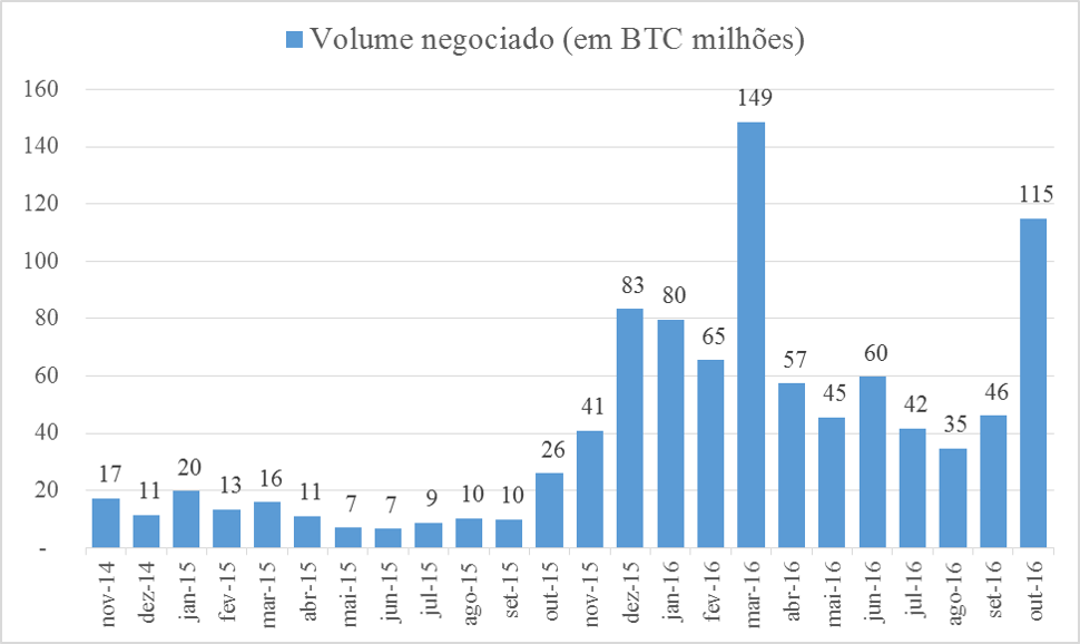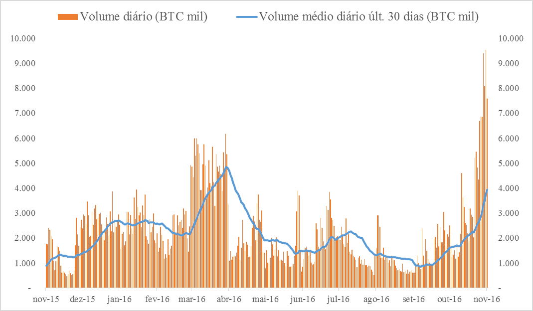 Em termos mensais, os volumes de negociação no último ano estão claramente acima dos anos anteriores. Outubro não bateu a marca de março de 2016, mas, se considerarmos os últimos 30 dias, é plenamente possível que um novo recorde ocorra nos próximos dias.