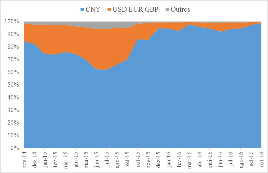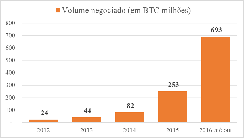 CNY/BTC é o principal trade há mais de dois anos. Nos últimos meses, a predominância chinesa nos altos volumes se consolidou ainda mais. Em 2016, os pares USD/BTC, EUR/BTC e GBP/BTC registraram não mais do que 8% do volume mundial total. A hegemonia das exchanges chinesas é inegável.