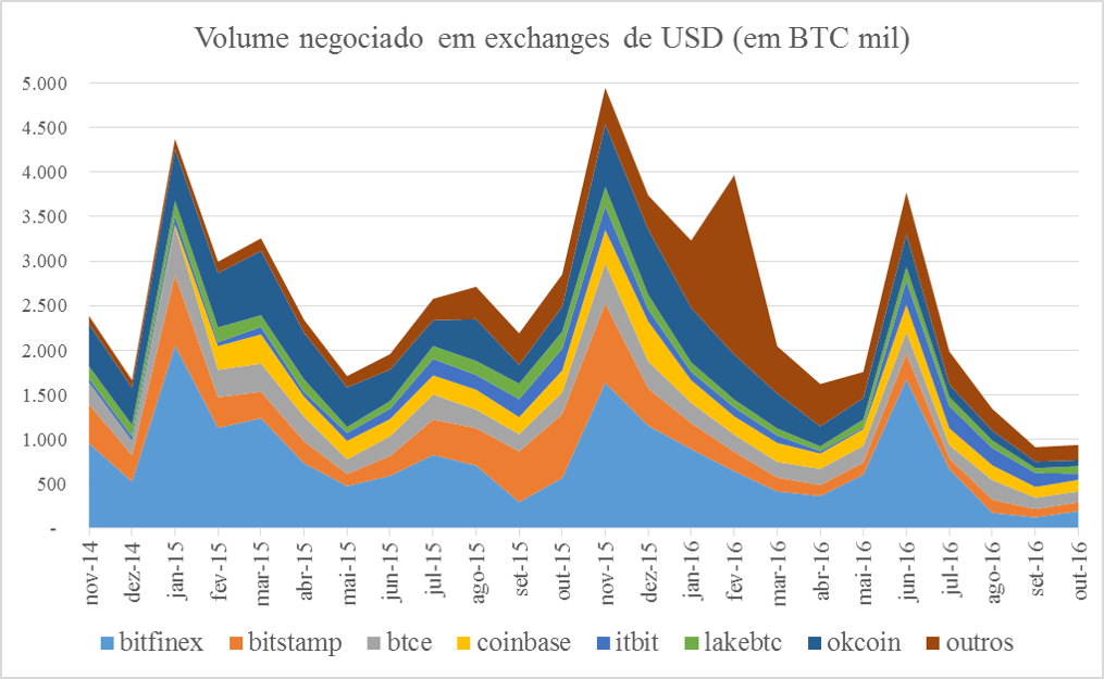 O fato é que o hack da Bitfinex deixou muitos traders ressabiados, afetando as negociações em todas as exchanges. A queda dos volumes coincide com o roubo da Bitfinex que, por sinal, era (e ainda é) a principal Exchange para negociações em dólares com cerca de 30% do mercado. Apesar de ter perdido market share, em outubro ainda foi responsável por 20% das negociações.