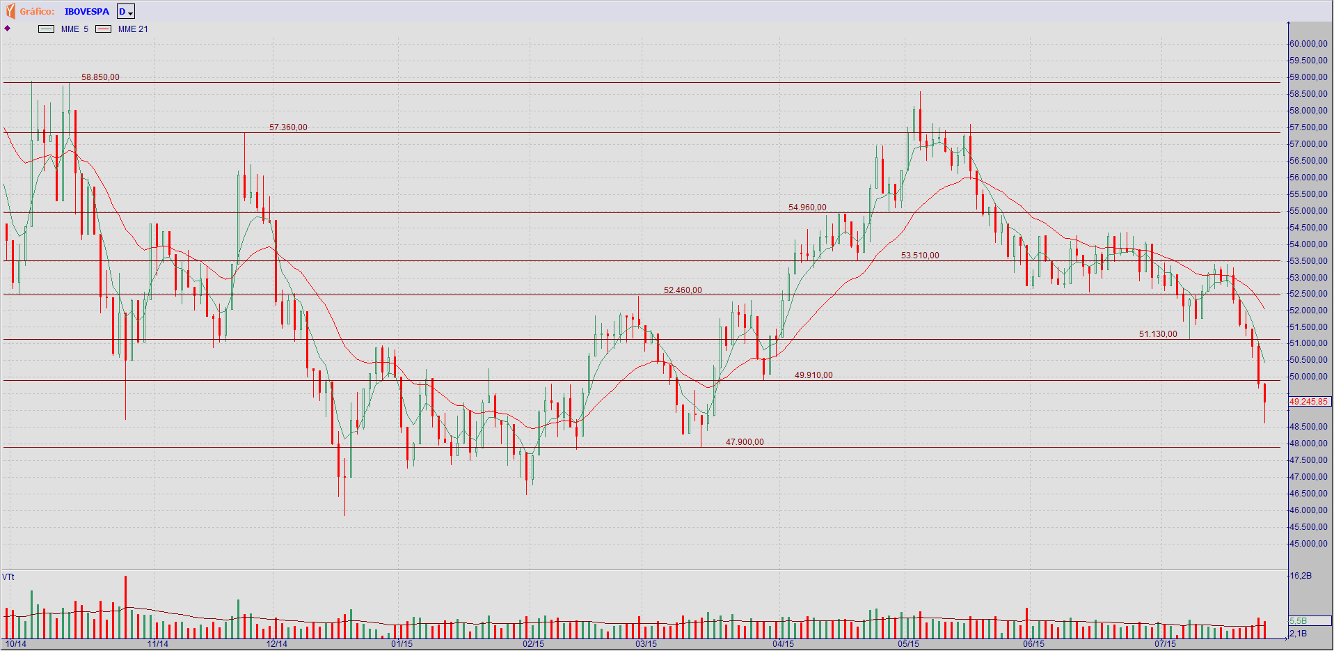 Se romper 49.835 e tiver forças para levar junto a 49.910, teremos repique de curto prazo, com potencial para beliscar a média móvel exponencial de 5 períodos ou mesmo 51.130.