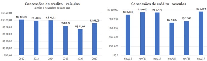 O ponto principal foi a volta do crédito! Segundo o BC, no período de janeiro a novembro de 2017, tivemos a liberação de crédito para o financiamento de veículos na ordem de R$ 91 bilhões. Esse volume é 21% superior ao mesmo de 2016 (R$ 74 bilhões). Para se ter uma ideia do crédito neste ano, somente no mês de novembro tivemos a liberação de R$ 9,594 bilhões – que foi o melhor novembro da nossa série histórica.