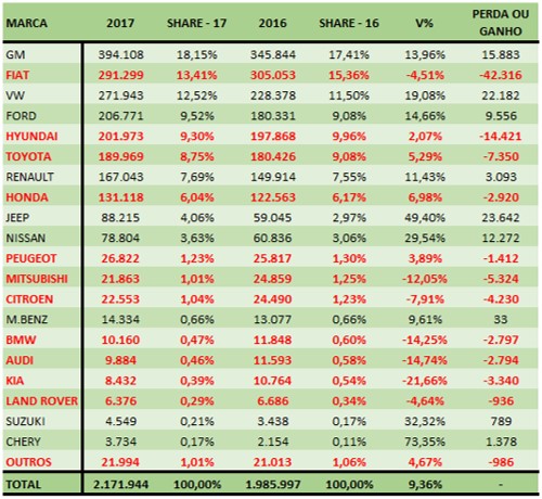 As vendas de 2017 fecharam em 2,172 milhões de carros, crescimento de 9,36% sobre o ano de 2016, quando foram vendidos 1,986 carros.