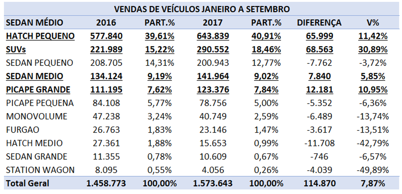 E o que está vendendo? Hatch Pequeno, SUV, Picape Grande e Sedan Médio: