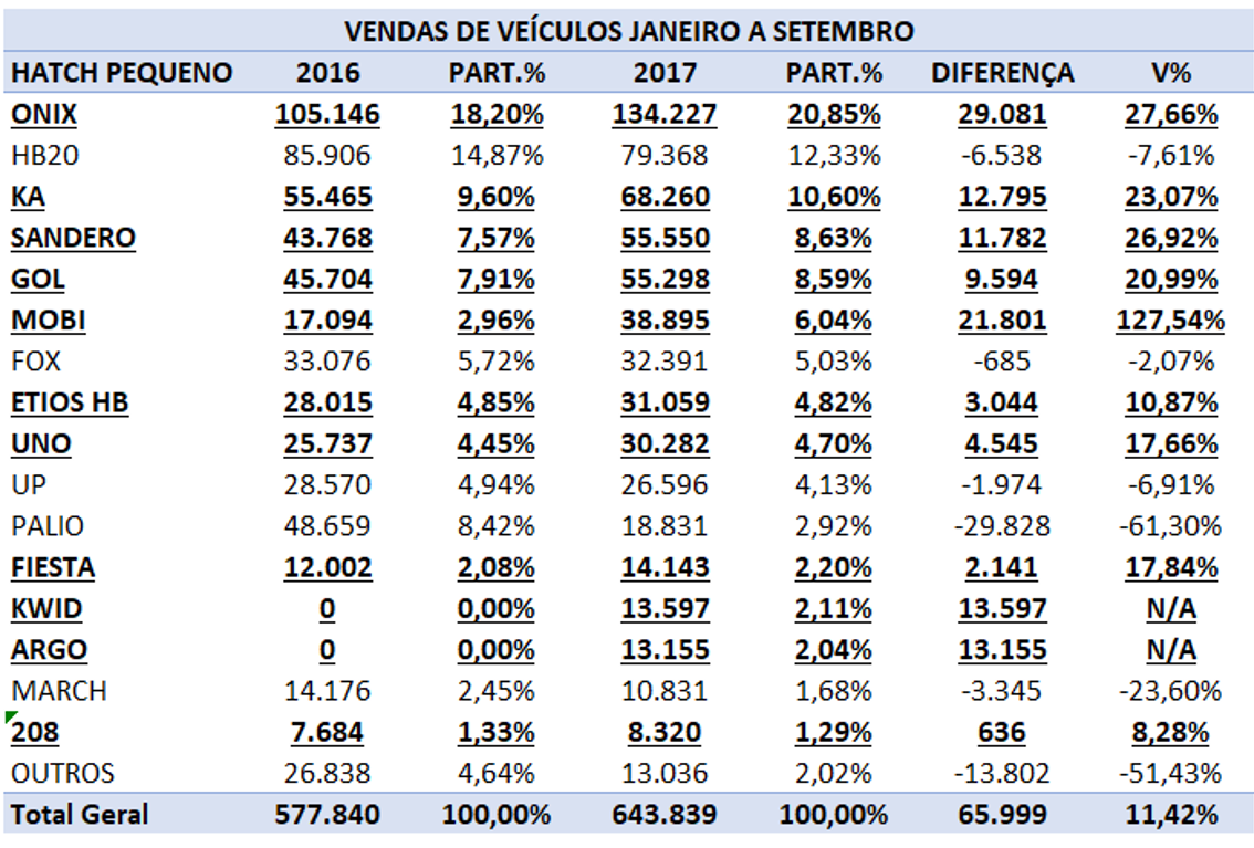 Esse crescimento foi avassalador! O destaque do mês foi a Renault, com crescimento de quase 70% sobre setembro do ano passado. Em setembro de 2016, a Renault vendeu 12,1 mil carros e neste mês foram 20,5 mil carros vendidos.