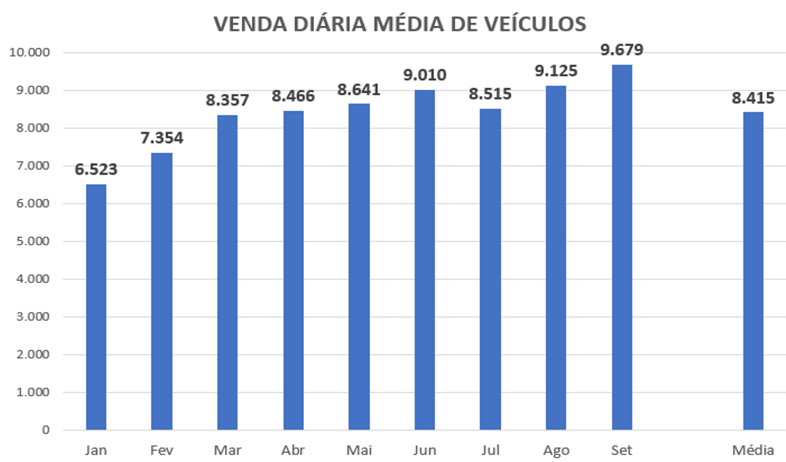 Também em setembro, foi quando tivemos a melhor média diária de vendas, quase 9,7 mil veículos por dia. Crescimento de 50% se compararmos com janeiro deste ano, quando vendíamos por dia 6,5 mil veículos