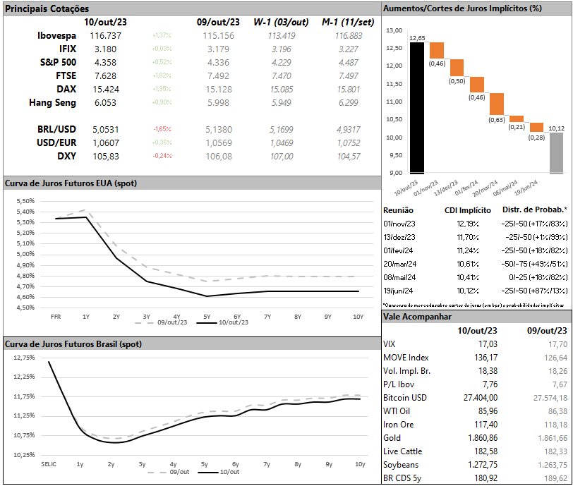 De novo, como todos os dias dos últimos três meses, o assunto principal foi a treasury de 10 anos. A curva fechou quase 15 bps, o que puxou junto os juros brasileiros. Mercado tá mais estranho que as roupas do Falcão (não o jogador de futebol, o Falcão Maia). Hoje já temos dados de inflação nos EUA (PPI, no caso), que podem reforçar o movimento, e a ata do Fed. Mas o grande ator da semana é o CPI, amanhã. Por aqui, temos IPCA. Na Argentina, dólar paralelo passa dos mil pesos. Israel lança “diaspora bonds”: US$ 5,4 bilhões em bonds de guerra. Na China, volta-se a falar em pacote de estímulos. Na sexta, reabre a temporada de balanços, como sempre começando pelos grandes bancos. Tem gestor de fundo que vai trabalhar no feriado.