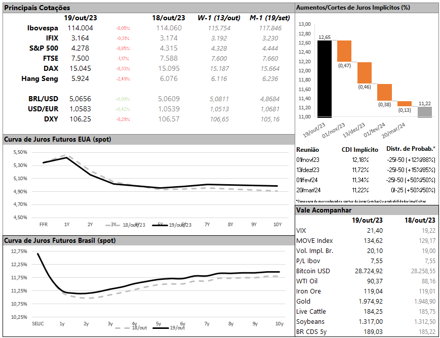 No congresso, ainda sem líder, a discussão é orçamento, principalmente de apoio militar. Biden diz que dá para ajudar todo mundo e tornar o mundo um lugar mais seguro. Os congressistas não têm tanta convicção assim. Enquanto o Biden discute um orçamento “nunca visto” para enviar ajuda à Israel, algumas armas e munições ‘pré-destinados’ à Ucrânia já estão sendo redirecionados para a guerra contra o Hamas. Eu quero que você imagine as reações privadas de algumas pessoas ouvindo essa história: Putin; Zelensky; Jim Jordan; Treasury de 10 anos (pois é, sempre ela).