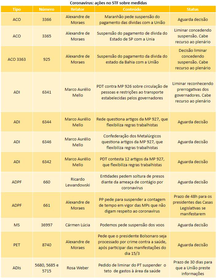 O Supremo Tribunal Federal tem recebido dezenas de ações propostas por governos, sindicatos e partidos políticos questionando reações de autoridades ou pedindo decisões sobre situações causadas pela crise do coronavírus nos últimos dias.