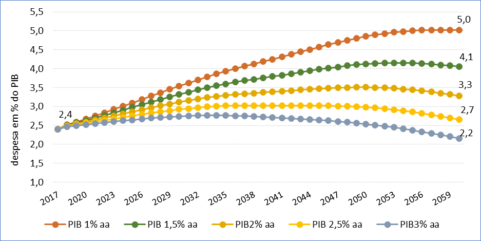Por fim, admitido um cenário moderado, de crescimento médio do PIB de 2% ao ano, a despesa bruta cresceria moderadamente até 2050. A partir daí, apresentaria tendência de queda, chegando em 2060 em 3,3% do PIB, com crescimento de 37% em relação a 2017.