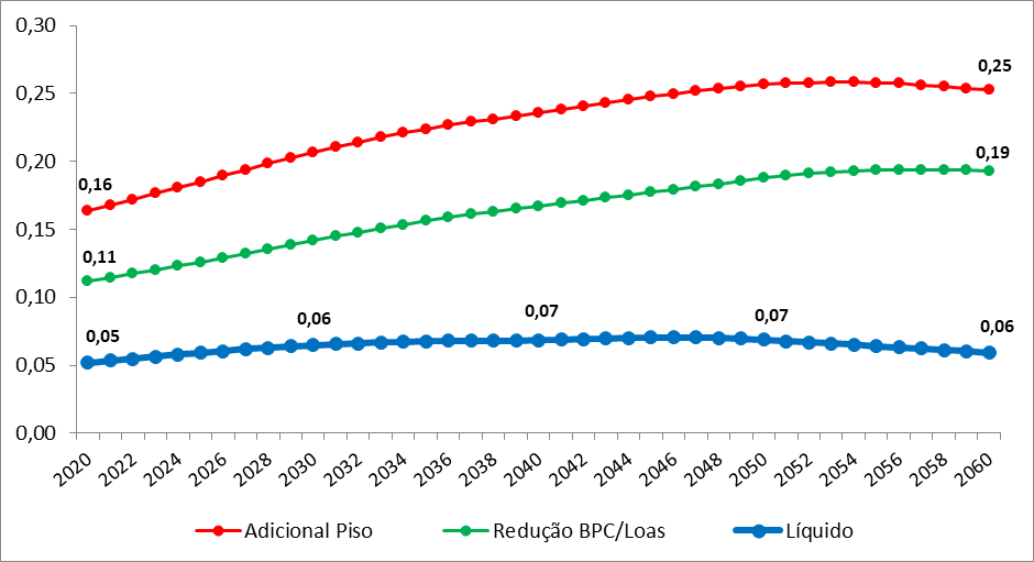 Considerada então a redução de despesa decorrente da extinção de benefícios não contributivos, o aumento líquido de despesa é de apenas 0,1% do PIB, tomando como base uma trajetória do PIB bastante conservadora.