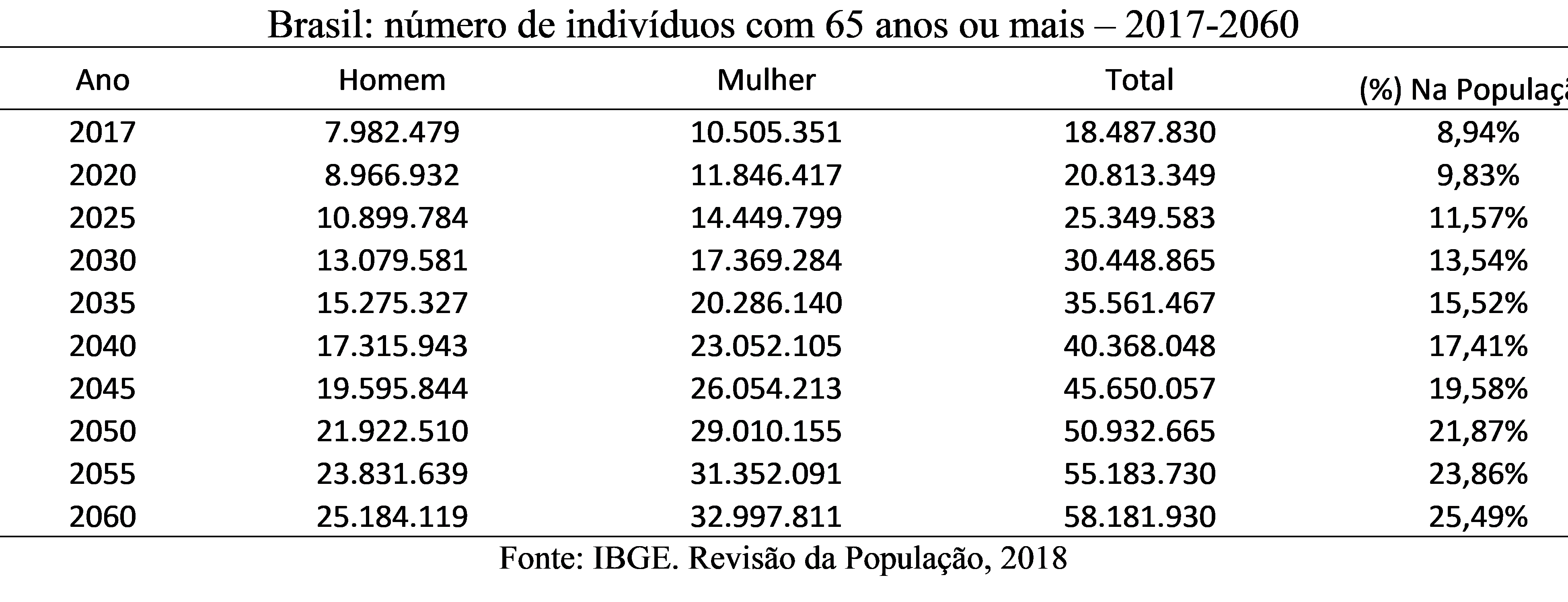 A tabela a seguir apresenta a evolução do número de potenciais beneficiários a partir de 2017 até o ano de 2060. Entre 2017 e 2060 o número de indivíduos com 65 anos ou mais saltará de 18,49 milhões para 58,18 milhões, ou seja, será multiplicado por mais de 3 vezes.