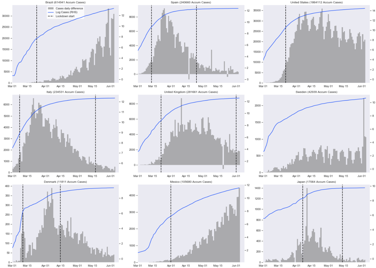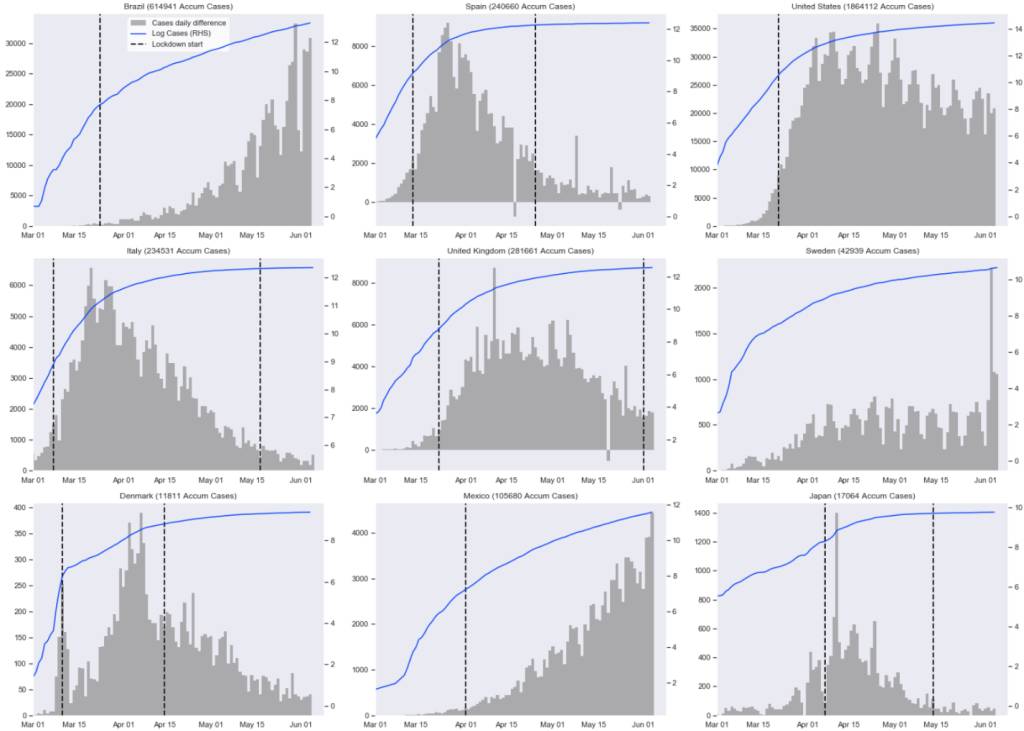 O painel abaixo (figura 1), inspirado numa ideia de John Cochrane, senior fellow da Hoover Institution e ex-professor de finanças da Universidade de Chicago, mostra a evolução do número acumulado de casos da Covid-19 em alguns países (eixo da esquerda) juntamente com a diferença diária nos novos casos (eixo da direita).