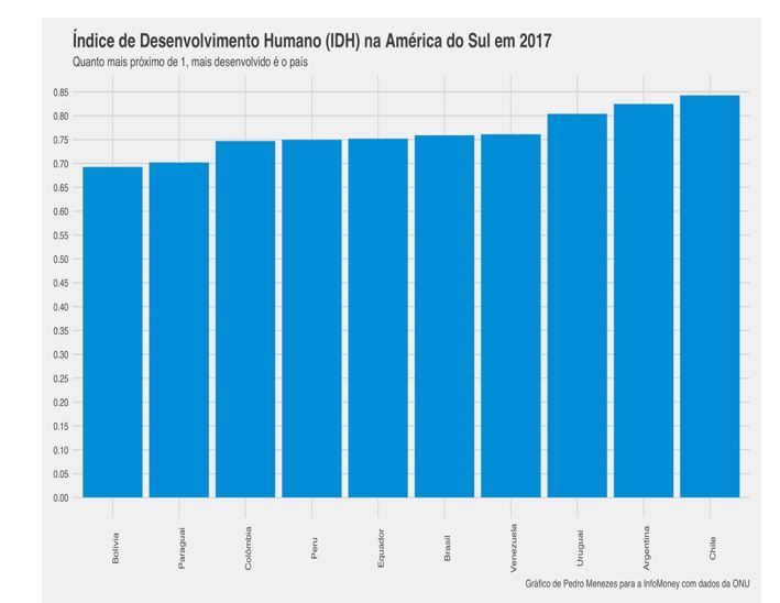 Em 2017, último ano com resultado divulgado no site da ONU, apenas dois países latino-americanos estavam entre os 50 primeiros do mundo no Índice de Desenvolvimento Humano (IDH): Chile, em 44º, e Argentina, em 47º.