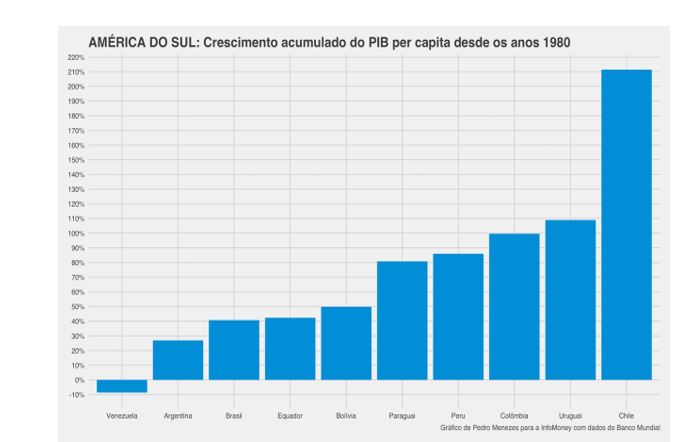 Isto foi possível graças a uma incrível expansão do PIB por pessoa. Desde 1986, o crescimento médio neste indicador foi de 3,6%. É um ritmo de crescimento muito mais próximo da Índia (4,7%) do que do Brasil (1,1%) ou Argentina (1%). Como resultado, o PIB per capita chileno mais do que triplicou no período, enquanto o crescimento acumulado no Brasil e Argentina ficou ao redor de 40%.