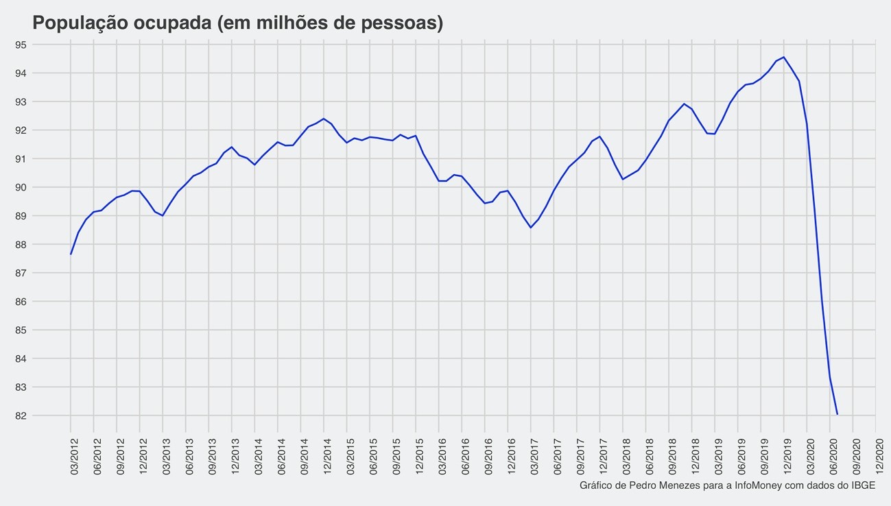 Outra forma de observar o mesmo fenômeno é analisar a evolução da população ocupada. Como se pode ver no gráfico abaixo, o número de pessoas empregadas é o menor da série histórica iniciada em 2012.