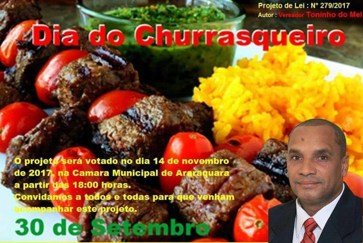 Mas antes, outro assunto de interesse da República, o dia do Churrasqueiro. Para a sessão do dia 14 de Novembro da Câmara Municipal de Vereadores de Araraquara/SP, o vereador Toninho do Mel do PT convidou toda a população da cidade para prestigiar a apreciação e aprovação do seu Projeto de Lei que, no fim, criou o dia do Churrasqueiro.