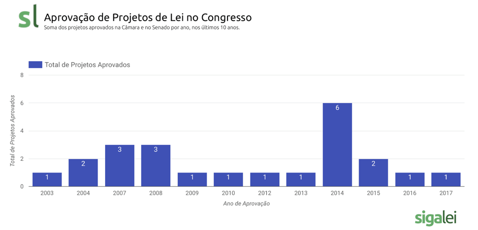 Analisando os Projetos de Lei aprovados, identificamos que desde 2003, foram aprovados 23 proposições, sendo o ano de 2014 o ano que mais teve projetos aprovados, 6.