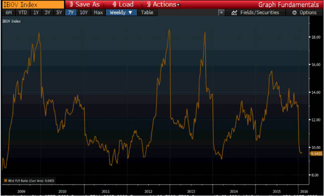 Atualmente, o índice negocia a 9,5x, porém, vale destacar, que ele já atingiu níveis menores de P/E, como em 2011, quando chegou a 8,6x, o que representaria um Ibovespa na casa de 34 mil pontos, mas que poderia apresentar uma queda um pouco maior, dado a piora no cenário político e desaceleração na China.