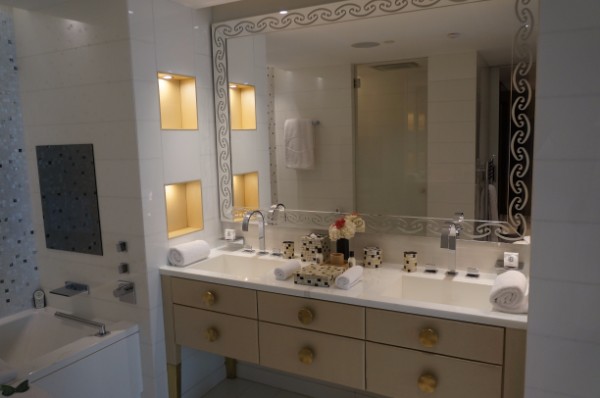 São mais de 100 metros quadrados – quem conhece Paris sabe o que isso representa em termos de hotel – muito mármore mesclando modernidade e toques clássicos.