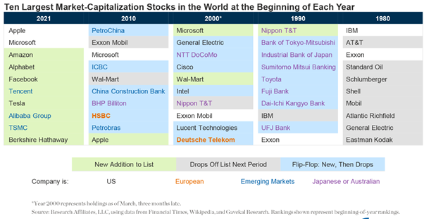 As empresas que dominam um Ãndice global de capitalização de mercado são, por definição, aquelas com os maiores market caps (quantidade de dinheiro que custaria se você fosse comprar todas as ações emitidas de uma empresa ao preço atual de mercado). E as empresas âTitãsâ podem permanecer no topo do âOlimpoâ por um longo perÃodo de tempo.