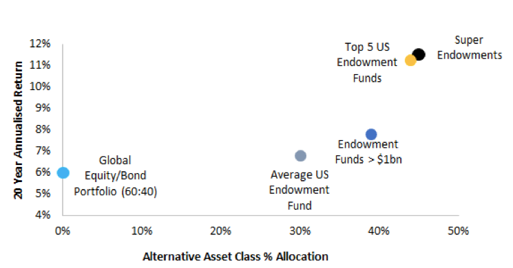 Os Top 5 US Endowments Funds, por exemplo, aumentaram gradativamente sua participação em alternativas mais ilíquidas ao longo dos anos.